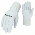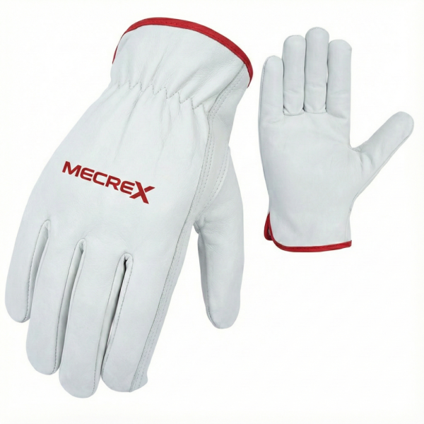 The Mecrex MR-1503 is a premium leather driver glove that adds a distinct visual flair to the classic utility design. It is crafted from high-quality White Grain Leather, providing a soft, supple feel and excellent durability. This model is distinguished by its Red Color-Coded Piping along the cuff hem and a matching Red “MECREX” logo printed on the back. It features a superior Keystone Thumb construction for maximum range of motion and an elastic shirred back for a secure fit.
