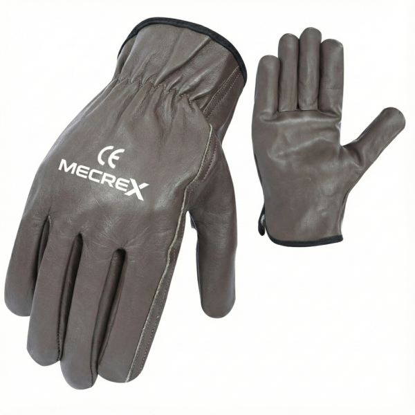 The Mecrex MR-1501 is a premium-grade driver glove designed for professionals who demand both style and certified safety. Constructed from high-quality Brown Grain Leather (Cowhide or Goatskin), it offers a sophisticated look and superior durability. Distinct from standard utility gloves, this model features a prominent CE Certification mark printed on the back, ensuring it meets European safety standards for mechanical risks. The glove is designed with a shirred elastic back for a snug fit and is finished with black piping along the cuff edge, suggesting a comfortable internal lining for cooler conditions.