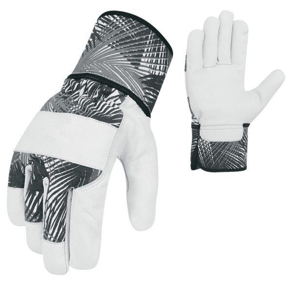 The Mecrex MR-6052 brings a contemporary edge to heavy-duty gardening gear. It features a sophisticated Monochrome Tropical Leaf print (grey and white palm fronds) on the back and cuff, paired with a pristine White Grain Leather palm. Designed for serious landscaping, it includes a wide Safety Cuff to protect the wrists from thorns and debris, and a solid White Leather Knuckle Strap for back-of-hand impact protection. This glove is perfect for professionals who want rugged functionality with a clean, modern look.