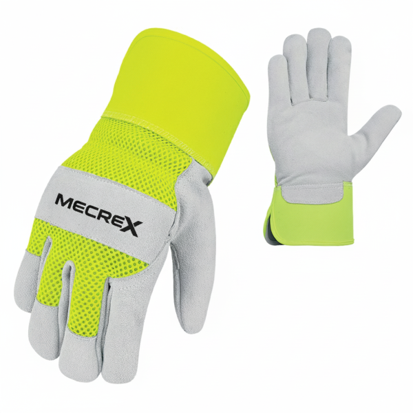 The Mecrex MR-6054 solves the common problem of overheating in heavy-duty work gloves. Unlike traditional canvas-back safety gloves, this model features a High-Visibility Lime Green Air-Mesh back, allowing for maximum airflow while still providing the rigid wrist protection of a Safety Cuff. The palm is constructed from durable Grey Split Leather (Suede), which offers excellent grip on rough materials like lumber and concrete. This glove is the perfect solution for summer construction and landscaping where both safety and coolness are required.