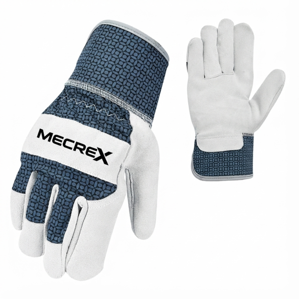 The Mecrex MR-6055 is built for the toughest jobs where grip and abrasion resistance are paramount. While it shares the modern “Blue Lattice” geometric print with the MR-6053, this model features a White/Grey Split Leather (Suede) palm. The textured surface of the split leather offers superior grip on rough or slippery materials like concrete blocks, lumber, and rebar. Combined with a rigid Safety Cuff and a reinforced knuckle strap, it is the ultimate workhorse for masonry and heavy construction.