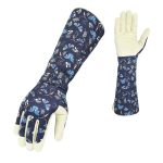 The Mecrex MR-6102 continues the tradition of superior forearm protection with a distinctive style. This “Gauntlet” glove features an extra-long protective cuff adorned with an intricate multi-colored Paisley print (featuring teal, red, and yellow swirls on a dark background), offering a bohemian, artistic flair. The hand portion is crafted from premium Tan/Cognac Grain Leather, ensuring softness and durability. A key addition to this model is the adjustable leather wrist strap, allowing for a customized, secure fit that prevents slippage during intensive pruning sessions.