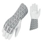The Mecrex MR-6111 offers robust forearm protection with a modern, nature-inspired edge. It features a premium White Top-Grain Leather palm, ensuring the highest level of dexterity and a soft feel for handling tools. The extended gauntlet cuff and back of the hand are constructed from heavy-duty canvas featuring an Abstract Sage Green & Black Camouflage print. This “splatter” style camo gives the glove a contemporary, outdoor-ready look that appeals to both gardeners and general outdoor enthusiasts who prefer a gender-neutral utility aesthetic.
