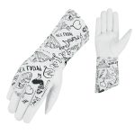 The Mecrex MR-6114 offers a unique visual texture that stands out in any garden tool collection. This gauntlet glove combines a premium White Top-Grain Leather palm for ultimate softness and control with an extended cuff featuring a “Distressed Gold” print. The pattern mimics the look of weathered paint, gold leaf, or rustic bark in a mustard-gold tone on a white background, giving it an artisanal, high-end feel while providing robust forearm protection.