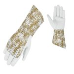 The Mecrex MR-6115 combines high-end material quality with a bold, industrial-chic aesthetic. It features a premium White Top-Grain Leather palm for exceptional softness and dexterity. The extended gauntlet cuff and back of the hand are constructed from durable canvas displaying a striking “Golden Grid” geometric print—textured gold and black rectangular blocks separated by clean white lines, resembling stylized brickwork or paving. This glove is designed for the modern gardener who appreciates structured design and robust forearm protection.