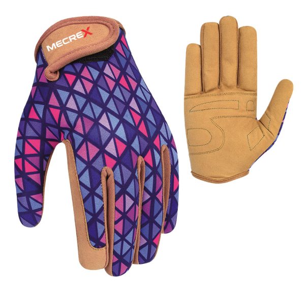 The Mecrex MR-6406 combines professional-grade protection with a bold, retro-inspired design. The back features a striking Purple, Blue, and Pink Geometric Triangle print (reminiscent of classic argyle or 80s patterns). The chassis is built for labor, featuring a robust Tan Synthetic Leather palm with Foam Padding and a Reinforced Thumb Saddle. It is secured by a comfortable Tan Velcro Strap with the MECREX Logo.