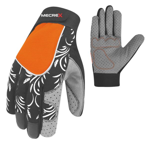The Mecrex MR-6418 is engineered for hot weather professional landscaping. It distinguishes itself with a large Bright Orange Mesh Panel on the back of the hand for high visibility and airflow, bordered by reflective piping. The surrounding fabric features a stylish Black & White Floral Swirl print. The palm is unique in the series, made of Grey Perforated Synthetic Leather, allowing heat to escape directly through the palm.
