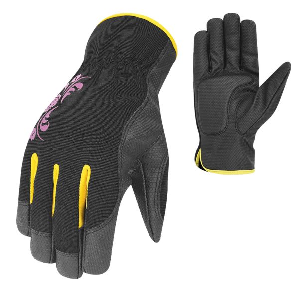 The Mecrex MR-6452 is a sport-inspired glove designed for maximum dexterity and visibility. The chassis is primarily Black, featuring a sleek Pink Floral Scroll print on the back. It is defined by its high-contrast Neon Yellow Finger Sidewalls (Fourchettes) and matching cuff binding. The palm utilizes a specialized Black Hex-Textured Synthetic for superior grip, reinforced with a padded patch.