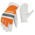 The Mecrex MR-3004 is a high-visibility general utility glove designed for optimal visibility and comfort. It features a bright Fluorescent Orange Back constructed from breathable fabric, making it highly visible in various environments. A wide Grey Reflective Knuckle Strap with a lime-green highlight strip runs across the back of the hand to ensure visibility in low-light conditions. The palm is made of soft, durable White Grain Leather (likely Goatskin or Cowhide), providing excellent tactile sensitivity and flexibility for general tasks. The glove is designed with a comfortable slip-on style with black binding on the cuff.