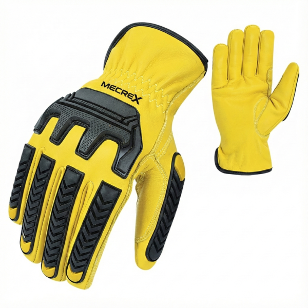 The Mecrex MR-1020 is designed for industrial environments where visibility is key, but the plastic/synthetic feel of fabric gloves is unwanted. It features a chassis made entirely from Bright Yellow Grain Leather, offering the highest visual profile of any leather glove in the series. The back is armored with a high-contrast Black TPR System, giving it a distinct “Bumblebee” aesthetic that is easily seen on job sites.