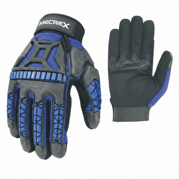 The Mecrex MR-1153 is a professional-grade impact glove designed for high-performance mechanical work where visibility is secondary to durability and stealth. It features a distinct Royal Blue and Black aesthetic with a heavy focus on segmented finger protection and vibration dampening.