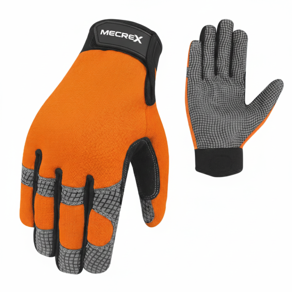The Mecrex MR-855 is a heavy-duty industrial grip glove designed for environments where visibility and traction are paramount. It features a bright Neon Orange Spandex back reinforced with textured knuckle guards. The palm is coated in a specialized Grey Grid-Texture Grip material that provides exceptional hold on wet or dry surfaces.