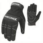 • Branding: Diagonal White Logo. The MECREX brand name is printed diagonally across the back of the hand in crisp white.