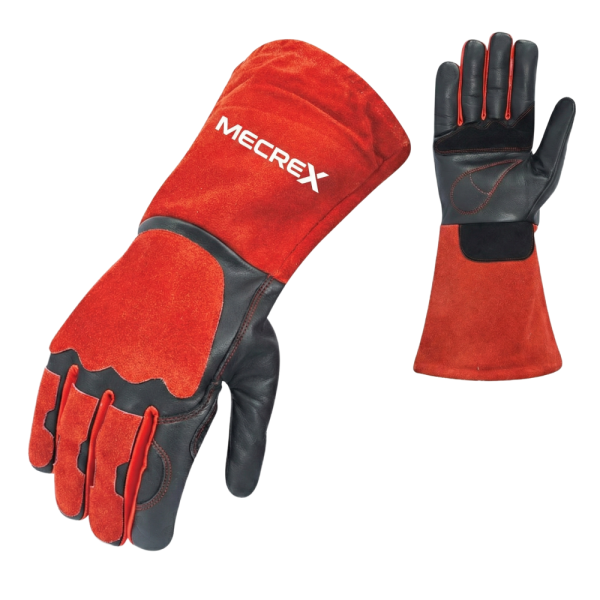 The Mecrex MR-3601 is an advanced heavy-duty welding glove designed for extreme heat applications and high-impact environments. It features a sophisticated multi-material construction, utilizing premium Black Grain Leather for the base hand and extensive Red Suede Reinforcements across the back of the hand, knuckles, and fingertips for superior thermal and abrasion resistance. This model is specifically engineered for maximum protection during intense welding and metalworking operations.