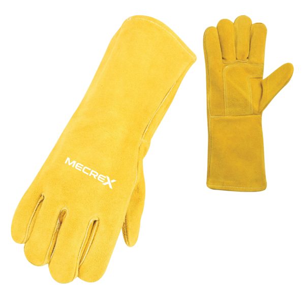 The Mecrex MR-3901 is a heavy-duty hybrid welding glove designed for high-abrasion environments. While maintaining the dexterity of a White Grain Leather chassis, this model features a strategic Gold Split Suede Reinforcement Patch across the palm, index finger, and thumb. This double-layer construction significantly extends the glove’s lifespan by protecting high-wear areas from friction, heat, and sharp edges, making it ideal for MIG/Stick welding and heavy material handling.