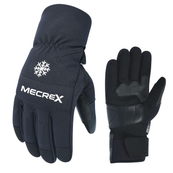 The Mecrex MR-6526 is a professional-grade winter glove featuring an all-black “stealth” aesthetic. It utilizes a wind-resistant Black Softshell back branded with a crisp white MECREX Logo and Snowflake Icon. The palm is engineered for durability, featuring a Black Synthetic Leather base with strategic Textured Grip Reinforcements and a leather wear patch at the wrist.