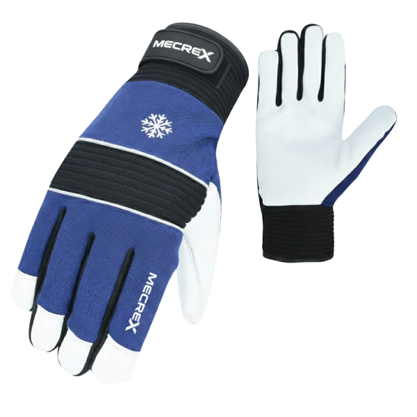 The Mecrex MR-6501 is a specialized thermal work glove designed for cold-weather utility and light industrial tasks. It features a distinctive Blue and Black knit back accented with a white snowflake icon, signifying its cold-weather application. The palm is constructed from Premium White Grain Leather, offering a superior tactile feel and natural wind resistance.