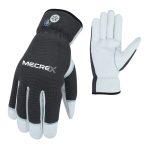 The Mecrex MR-6507 is a heavy-duty winter glove engineered for jobs requiring superior hold on wet or icy surfaces. The chassis is built from premium White Grain Leather and Black Water-Resistant Softshell. Its defining feature is the extensive Black Textured Grip Overlay on the palm and fingers, stitched with high-contrast white thread. An extended Ribbed Knit Cuff ensures thermal retention.