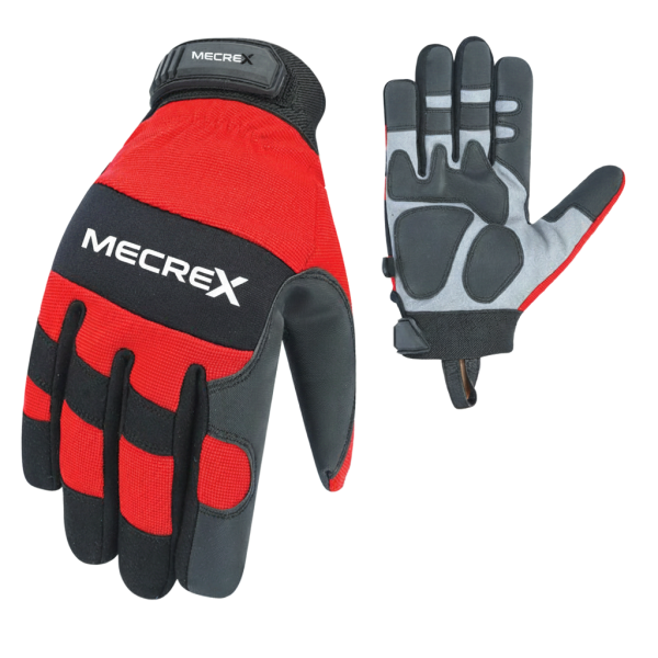The Mecrex MR-6548 is a lightweight, sporty mechanic’s glove designed for speed and precision. It features a breathable Red Mesh/Spandex back with a bold black knuckle bar. The palm is constructed from Grey Synthetic Leather reinforced with segmented Black Grip Patches. It includes a Rubber Molded Wrist Tab and a convenient Hang Loop.