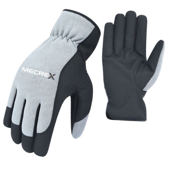 The Mecrex MR-6553 is a light-duty general purpose glove designed for maximum breathability and dexterity. It features a textured Grey Knit Fabric back that promotes airflow, paired with a flexible Black Synthetic palm. The glove offers a simple slip-on fit with elastic wrist gathering, making it an ideal choice for low-risk handling tasks.