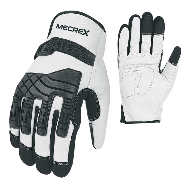 The Mecrex MR-6554 is a premium industrial safety glove designed for rigorous environments like oil and gas or mining. It features a chassis of high-quality White Grain Leather reinforced with comprehensive Black TPR Impact Armor on the back of the hand. Uniquely for a driver style, it includes a Nylon Cinch Strap across the back for a locking fit.