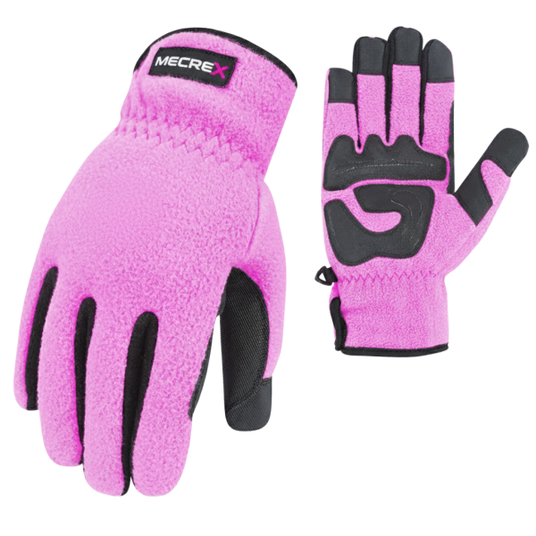 The Mecrex MR-6514 is designed for comfort and warmth in cold, dry conditions. The chassis is constructed from soft, high-visibility Pink Polar Fleece, making it instantly cozy and visually striking. Despite its soft appearance, it features a rugged Black Textured Grip Overlay on the palm, ensuring the user maintains a secure hold on shovels, steering wheels, or dog leashes.